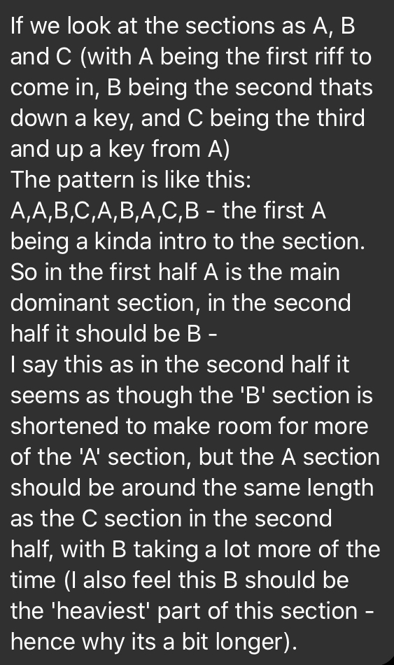 So I did was made the annotated diagram, shown above. This made the pattern a lot clearer. 9, 10, then 4-10-4, 4-10-4. It’s still a lot to focus on live, because the bits in between are so hypnotic & tight – there’s no room for error. The normal 3/4 sections in between fills were always either 6 bars, or 2 bars – with the two bar versions only found in the 4-10-4 sections. Still, a lot of counting to do!