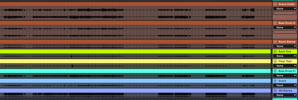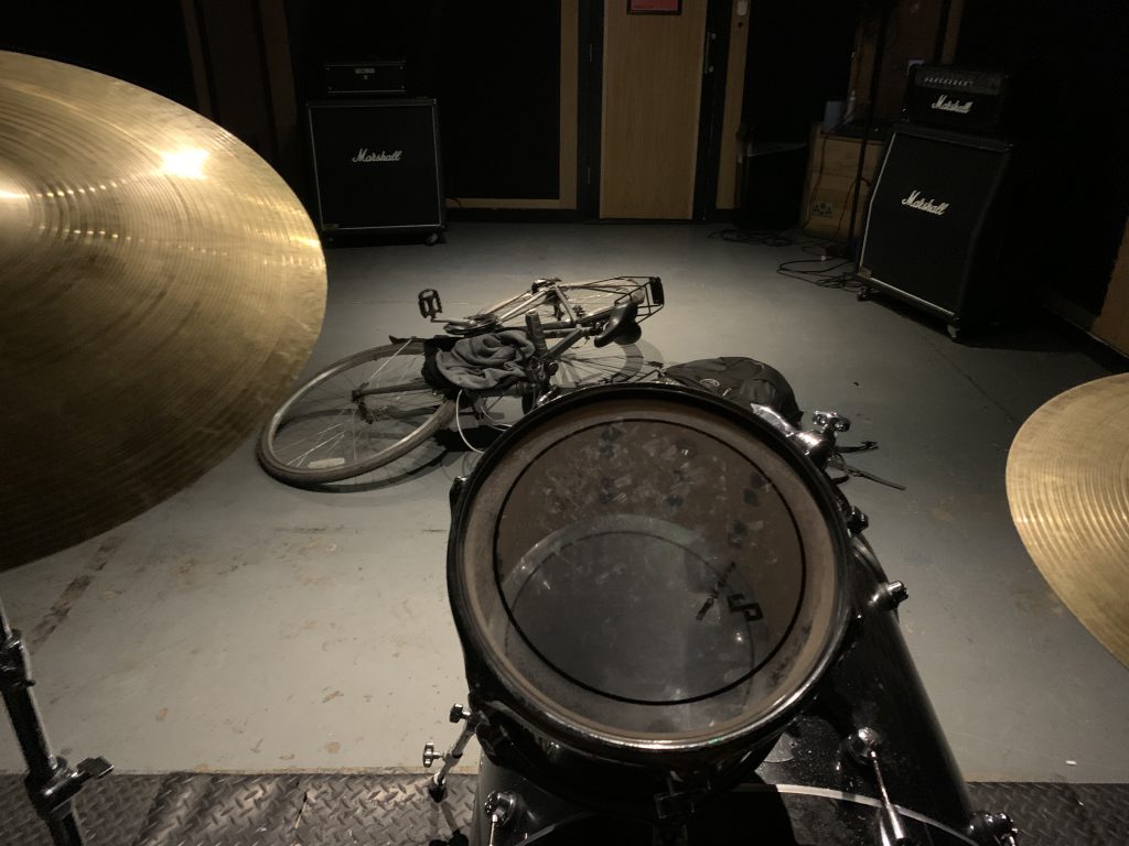 I’d mic up the drums in to two separate Zoom recorders (giving me two snare mics, two bass drum mics, two overheads, two room mics, and rack + floor tom). I went for more mics than technically needed because a) my mics weren’t very good, and b) I couldn’t properly check how good the recording was while at the room, so I was just trying to make sure at least some of it was OK.