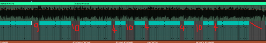 This would be fine, except, in true Wallowing fashion – there were some spanners thrown in the works. There were some weird little filler transitions on the guitars between segments, and they were different lengths. So, I’d get 6 bars being able to play 3/4, and then I’d be thrown a measure of 9 eighths before an obvious ‘reset’ – which would be fine if I was playing double-timed, and sitting on those 8ths… but as I’m on 3/4, this ends up 1.5 bars for me. Next time I get thrown 10 eighths, which isn’t even as nice as 1.5 bars. The time after that, just 4. Then a 10 again…