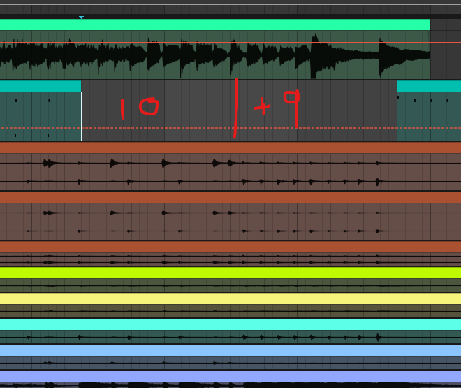 The 4, well, I figured I’d just kick all 4 of those 8ths, with a china accent. That’s how it ended up how it ended up. The section leading out was basically a 10 again but followed by 9 stabs (the guitar noticeably switched up here, so this dynamic made sense).